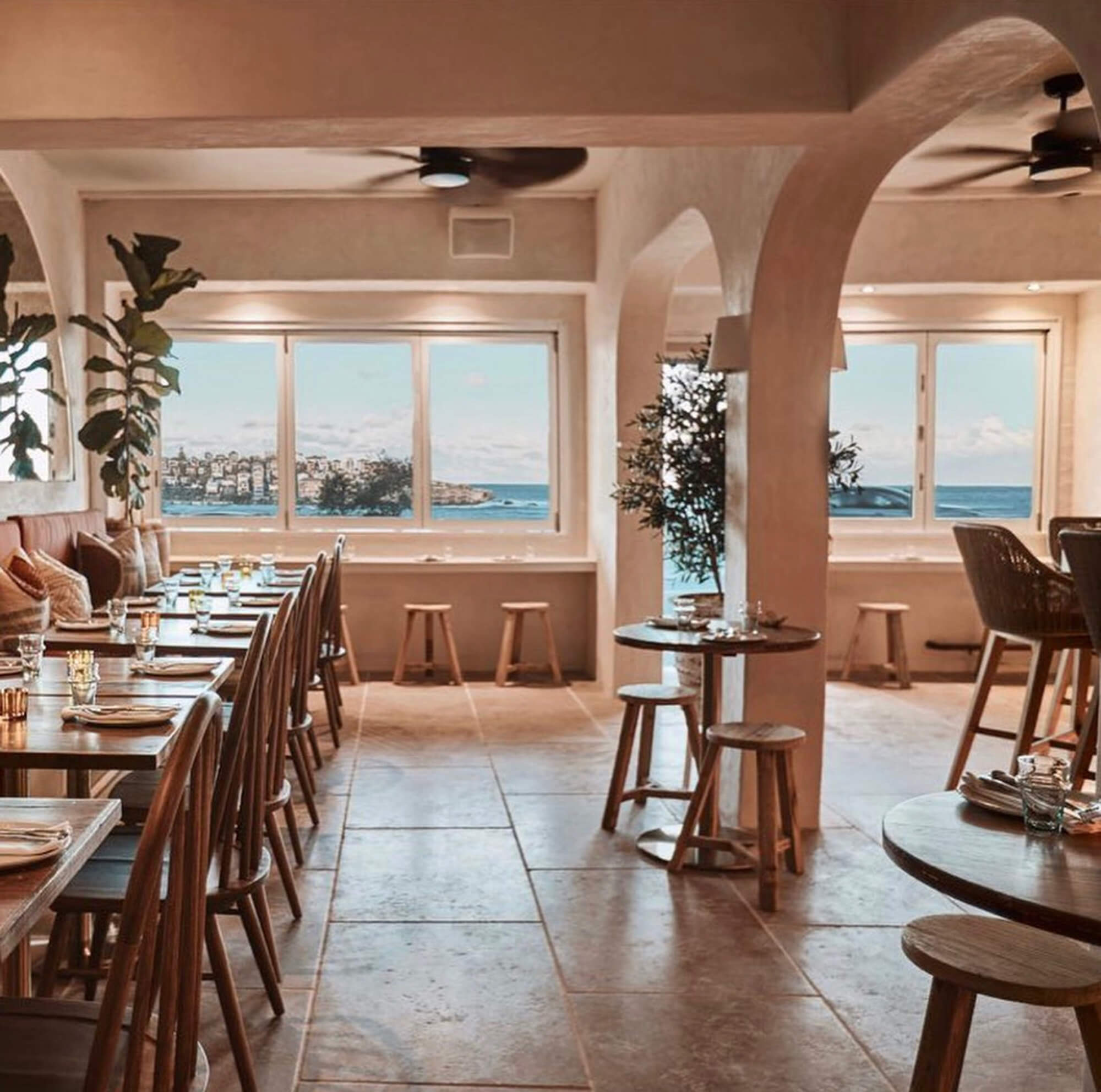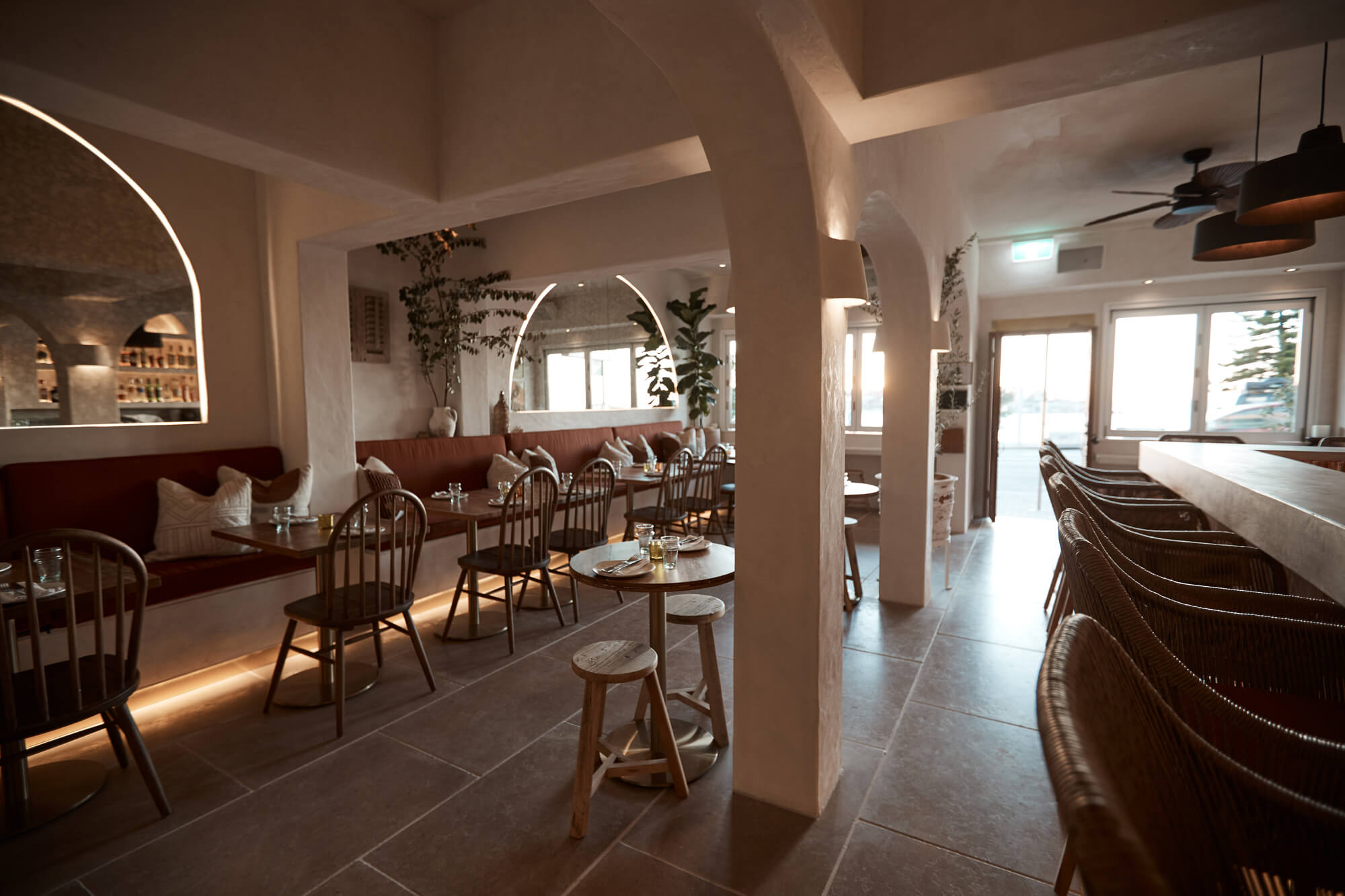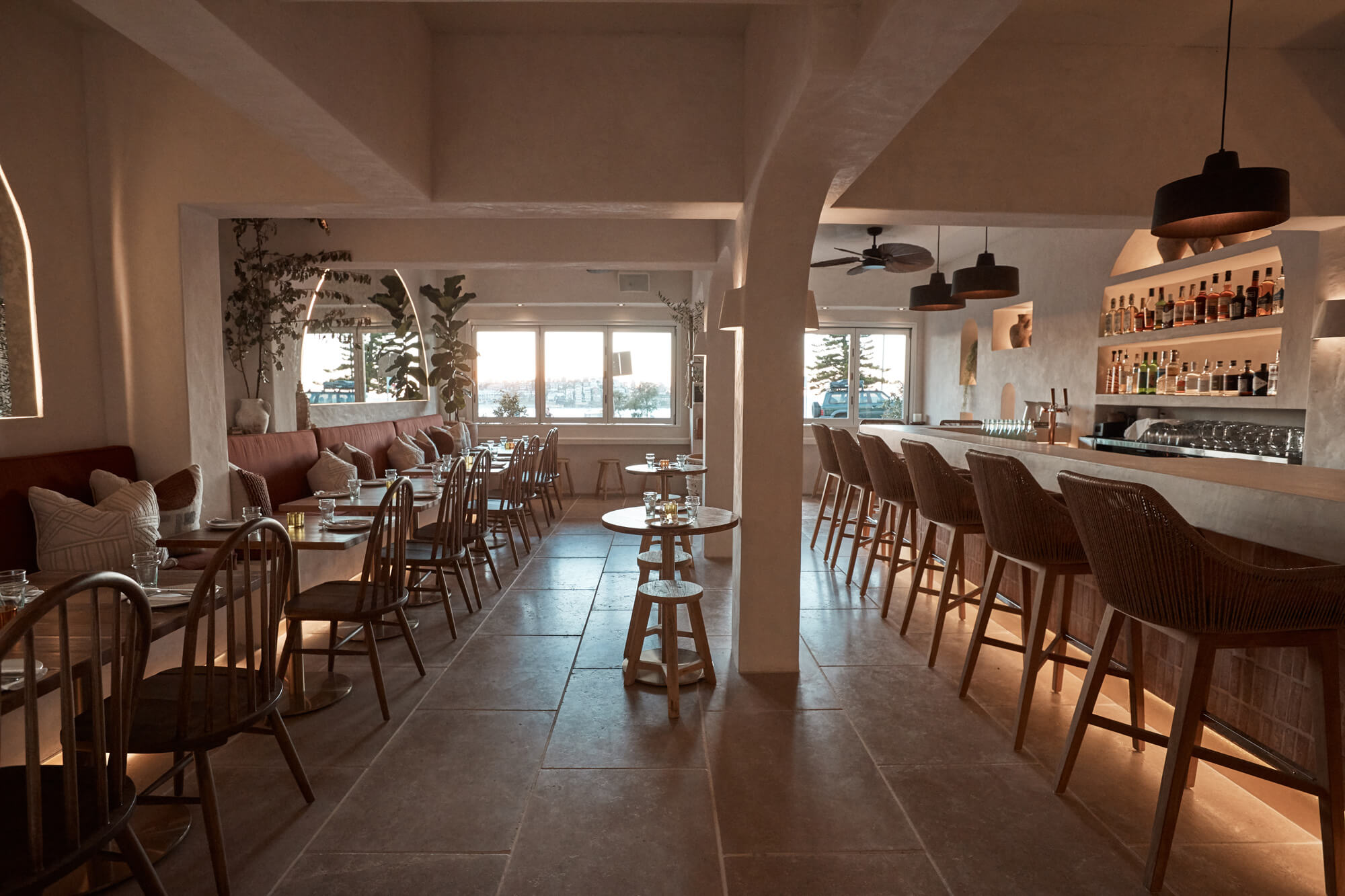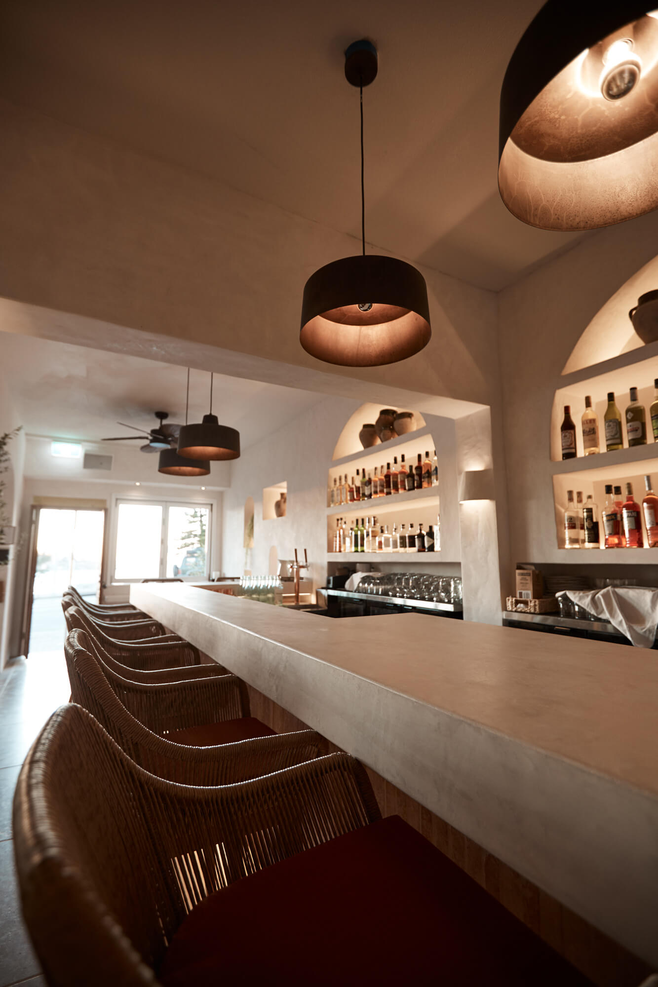 A true reflection of Mediterranean elegance, Ikaria Bondi showcases high-end craftsmanship and a seamless blend of natural textures. Microcement walls flow throughout, extending to the bespoke bar bench and tops, creating a refined, organic aesthetic. Handmade feature tiles and natural stone floors add depth and character, while custom in-built joinery—expertly crafted by Nomad Built carpenters—enhances both form and function. A full upgrade to the commercial kitchen ensures top-tier performance, supporting this vibrant and bustling Mediterranean restaurant and bar.