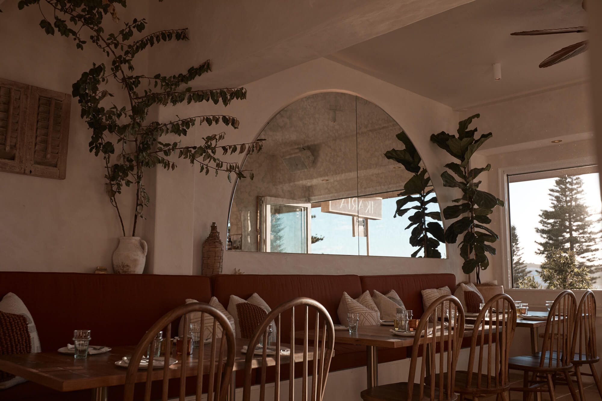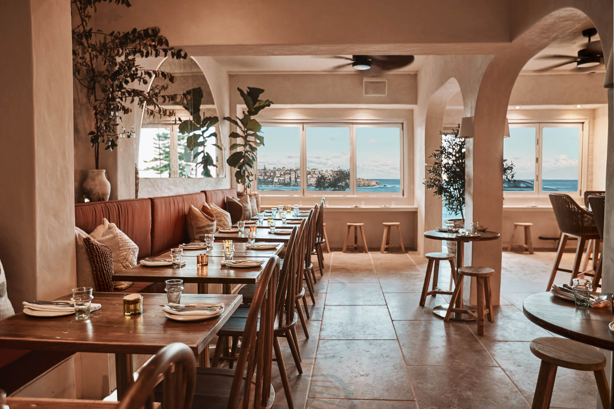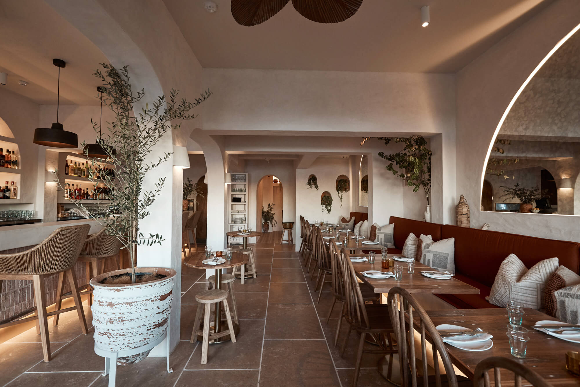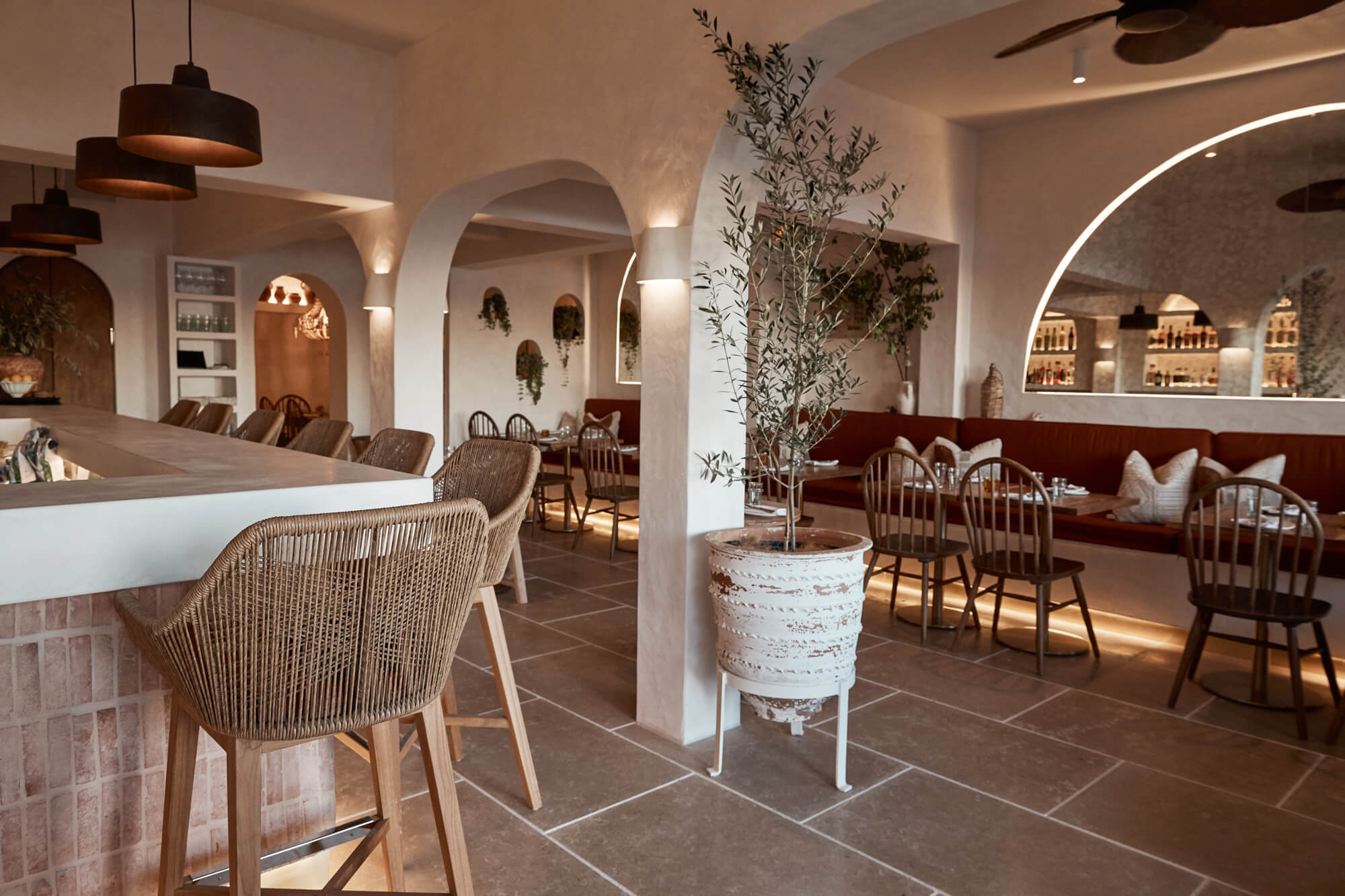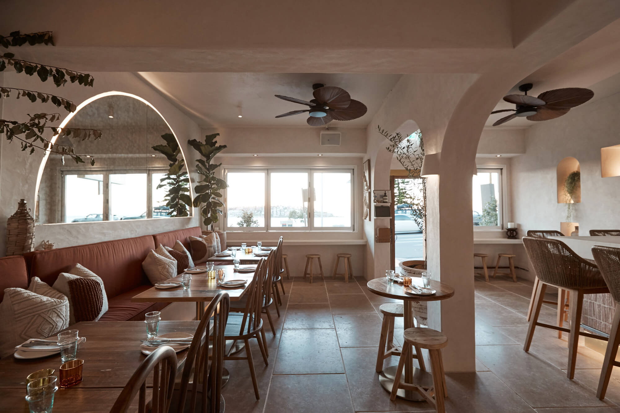 A true reflection of Mediterranean elegance, Ikaria Bondi showcases high-end craftsmanship and a seamless blend of natural textures. Microcement walls flow throughout, extending to the bespoke bar bench and tops, creating a refined, organic aesthetic. Handmade feature tiles and natural stone floors add depth and character, while custom in-built joinery—expertly crafted by Nomad Built carpenters—enhances both form and function. A full upgrade to the commercial kitchen ensures top-tier performance, supporting this vibrant and bustling Mediterranean restaurant and bar.
